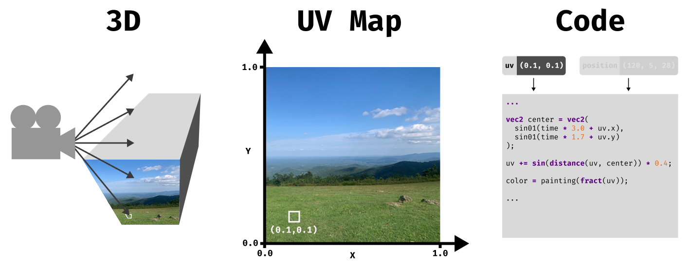 The camera in our 3D scene figures out which parts of the 3D faces are visible. Next, it uses the parts of the image texture we reserved for each face (the UV mapping) to calculate its UV coordinate. Finally, it gives this UV coordinate (and other information like the 3D position) to our code and our code determines the color