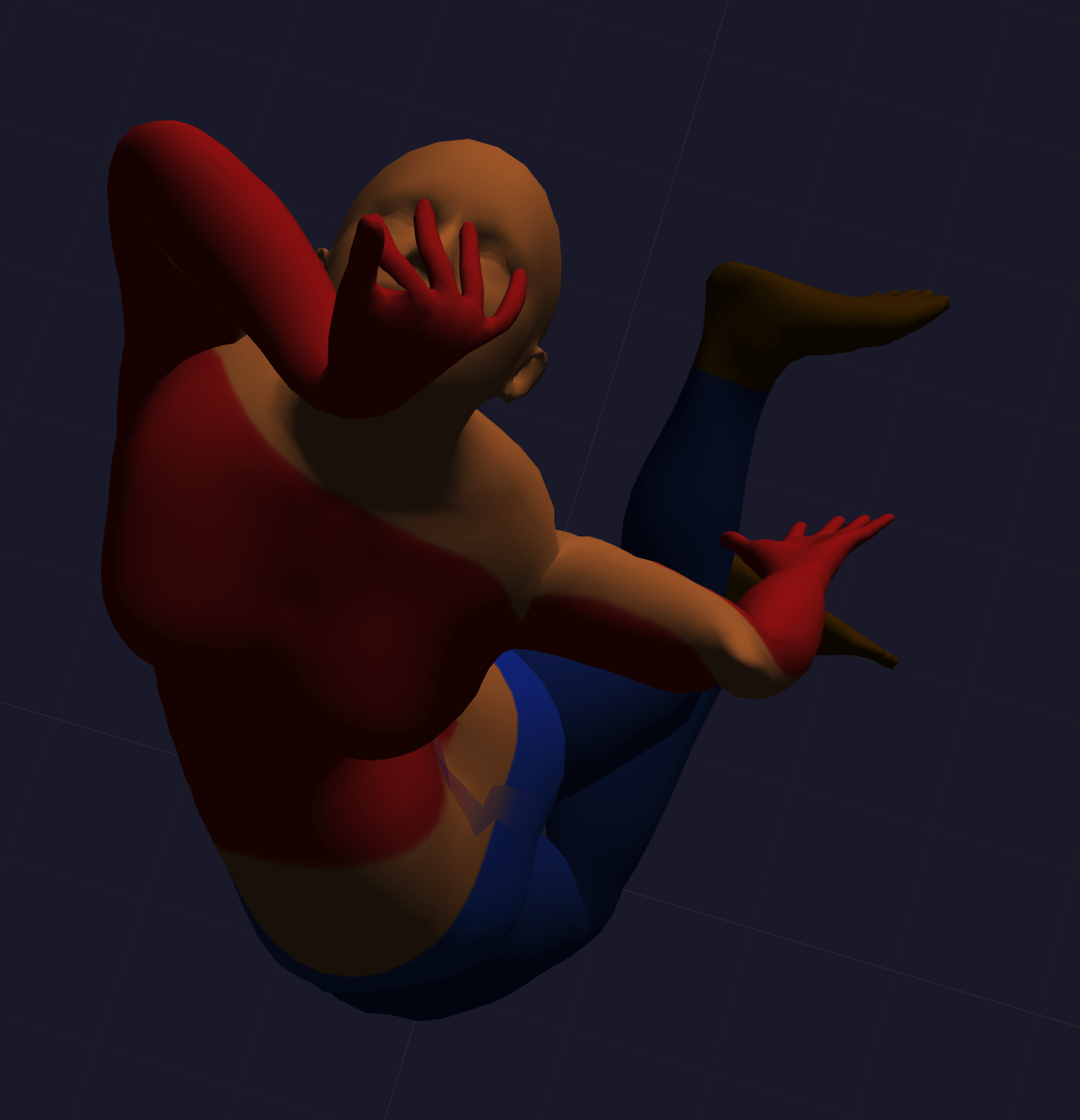 I used the SMPL family of body formats in the motion capture. The SMPL (Skinned Multi-Person Linear) model was created by scanning thousands of adult bodies. Using a 3D camera, they recorded the positions of millions of points that outline the bodies in 3D space.